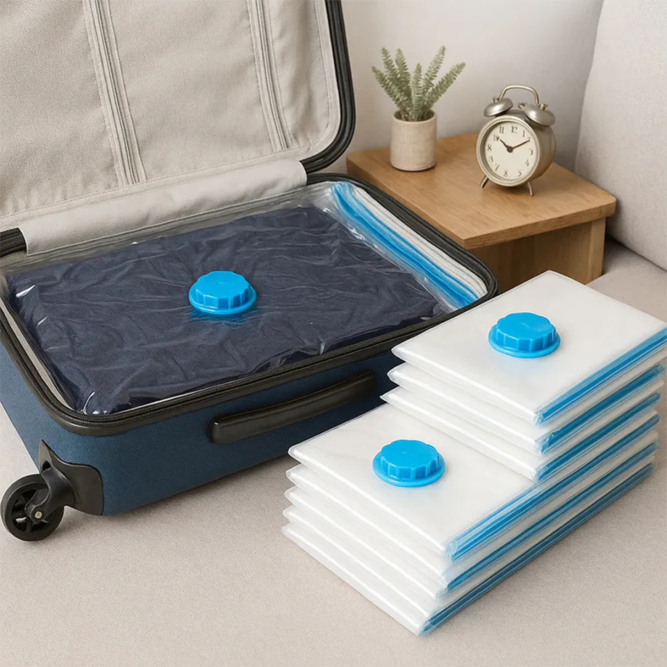 ¡Chau al placar explotado! 🧺 Estas bolsas de compresión (pack x3 o x5) reducen hasta 3× el volumen de acolchados, frazadas, abrigos y ropa fuera de temporada. Con válvula unidireccional y doble cierre zip, son reutilizables, protegen del polvo y los olores, y funcionan con la bomba manual o aspiradora doméstica.